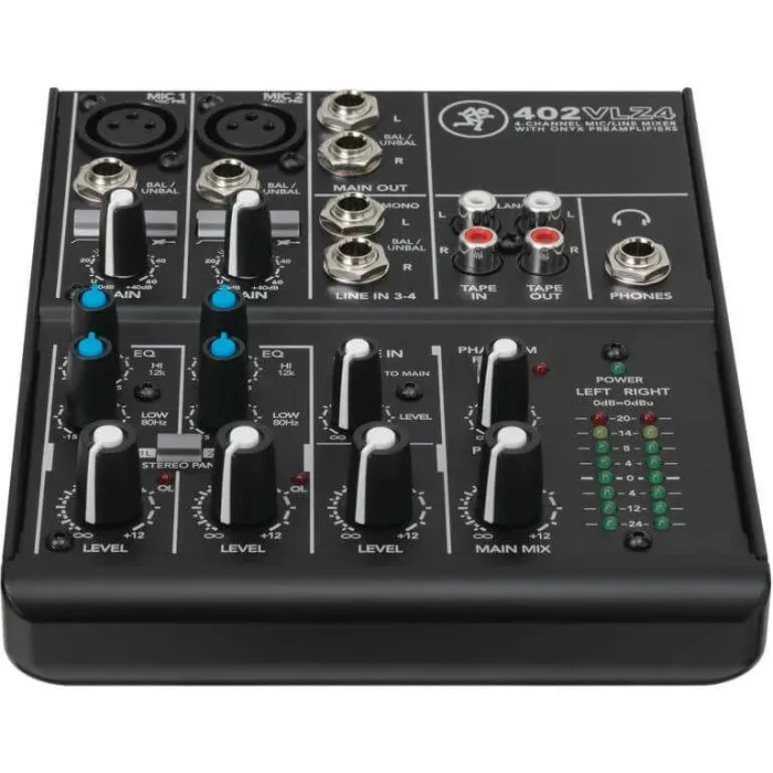 402VLZ4, iki Onyx mikrofon preamfisi ve stereo hat girişleri ile çok yönlü bağlantı seçenekleri sunar. Her kanalda yüksek/low EQ kontrolleri bulunur. Kompakt boyutu sayesinde taşınabilirliği kolaydır ve masaüstü kullanımlarda minimum yer kaplar. Dayanıklı yapısı ile hem sahne hem de stüdyo ortamlarında güvenle kullanılabilir.