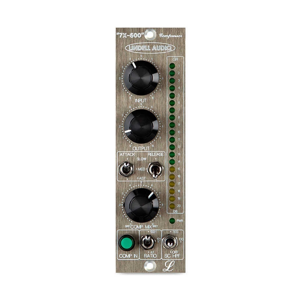 Lindell Audio 7X‑500, tek kanallı bir FET tabanlı kompresör/limiter modülüdür (500‑Series format). Bu ünitede yan zincirde (side‑chain) bir yüksek geçiren filtre (High‑Pass Sidechain Filter) ve paralel kompresyon için “Mix” kontrolü bulunur. 7X‑500, klasik 1176 tarzı ses karakterini sunar; ratio 100:1 (All‑In) ayarıyla agresif, rock’n’roll tarzı kompresyon üretilebilir.