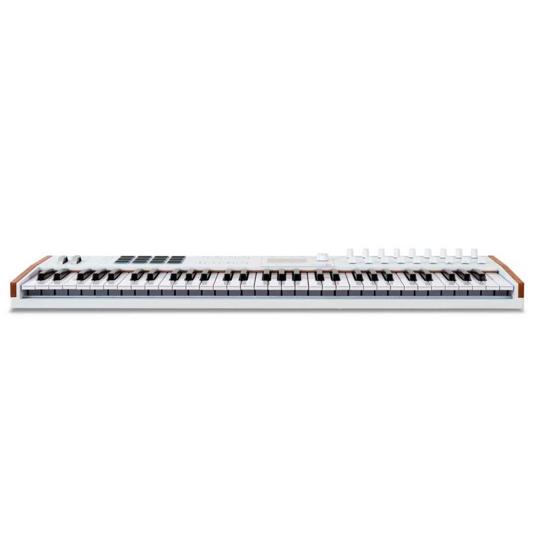 Arturia KeyLab 61 Mk3, modern ve estetik bir tasarıma sahiptir. Beyaz renk seçeneği, hem şık bir görünüm sunar hem de sahnede dikkat çekici bir unsur haline gelir. Klavyenin metal şasisi ve dayanıklı yapısı, uzun ömürlü kullanım için idealdir. Bu sağlam yapı, hem sahnede hem de stüdyoda güvenilir performans sağlar.