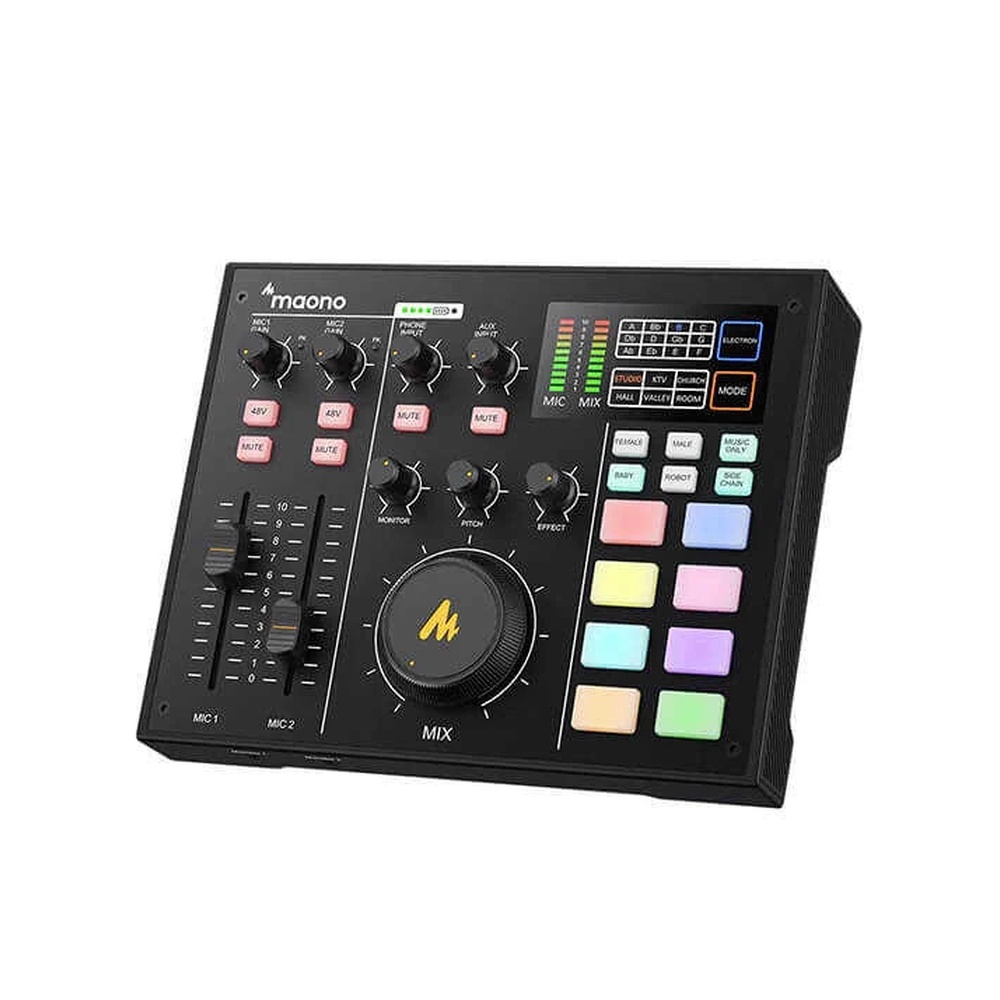 Maono AU-AM100 Maonocaster, podcast, yayın, radyo programları ve canlı yayınlar için tasarlanmış tam donanımlı ve taşınabilir bir podcast stüdyo mixeridir. USB arayüzü, dahili bataryası ve sezgisel kontrol yüzeyiyle kullanıcı dostu bir içerik-prodüksiyon çözümü sunar.