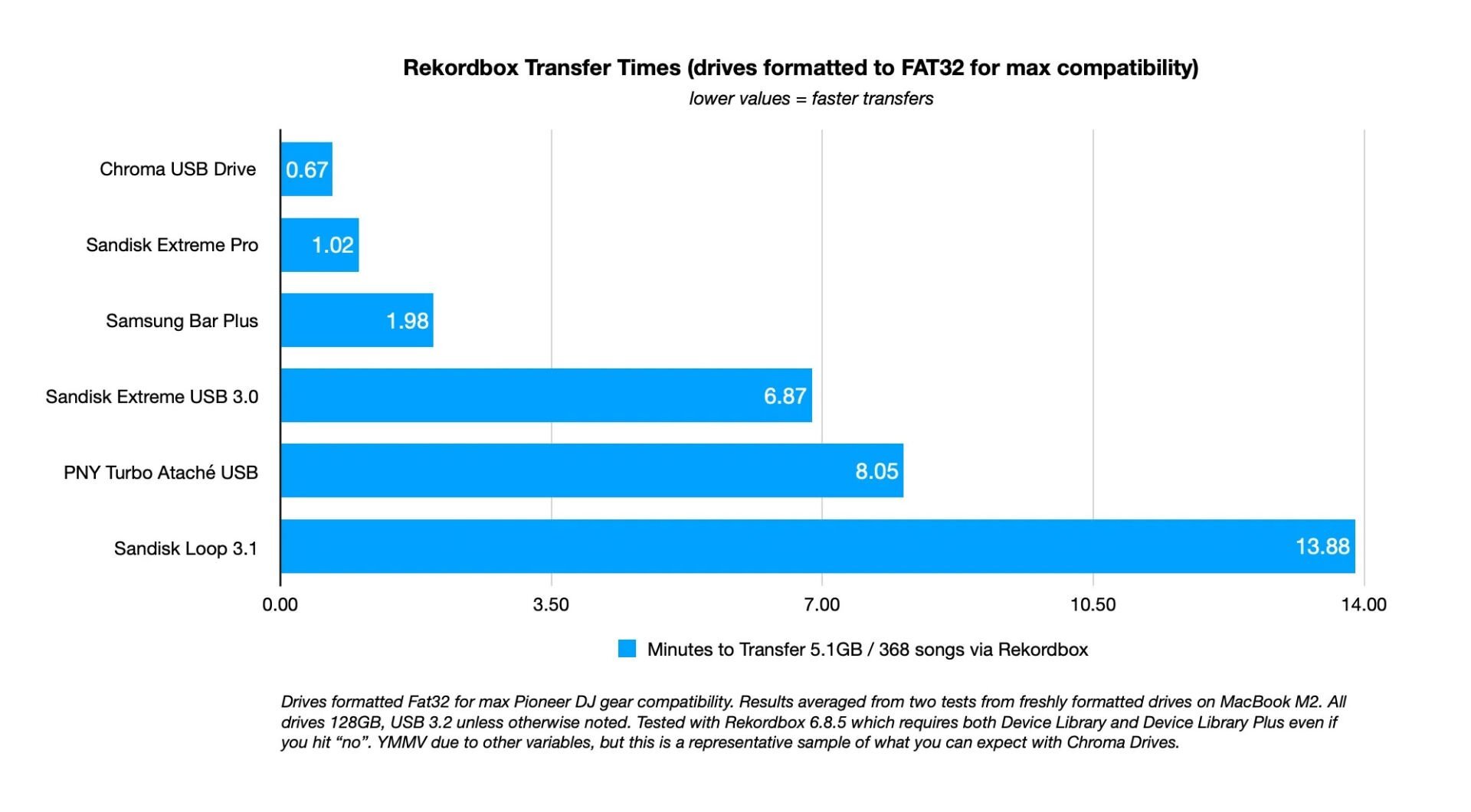 İşte Rekordbox'tan dışarı aktarırken sürücümüzün diğerlerine karşı hızı. Rekordbox aktarımları 10 GB'lık bir film dosyasını kopyalamakla aynı şey değildir - yüzlerce küçük dosyayı taşır ve kontrol eder: