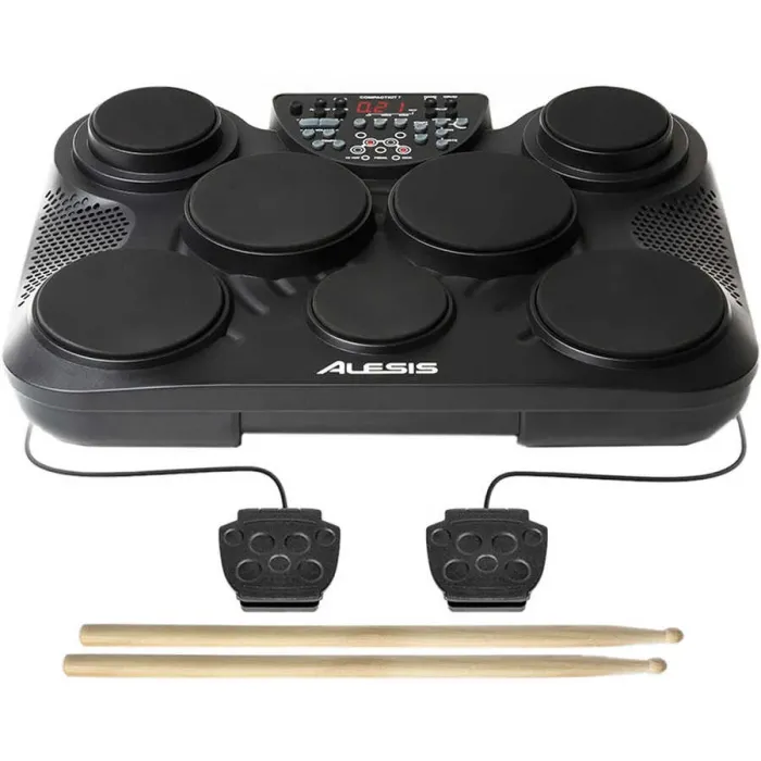 Alesis CompactKit 7, yedi adet hız duyarlı davul pedi ve iki pedal (hi-hat ve kick davulu için) ile donatılmış, masaüstü elektronik bir davul setidir. Bu özellikleri sayesinde, gerçek bir davul setinin hissiyatını ve tepkisini sunar. 265 perküsyon sesi, 45 ön ayarlı davul kiti ve 100 eşlik şarkısı ile kullanıcılarına geniş bir ses yelpazesi sağlar. Ayrıca, USB-MIDI çıkışı sayesinde DAW yazılımları ve eklentileri ile uyumlu çalışarak, kayıt ve prodüksiyon süreçlerini kolaylaştırır. Kompakt tasarımı ve pil ile çalışma imkanı sayesinde, müzisyenler diledikleri her yerde pratik yapabilir veya performans sergileyebilirler.