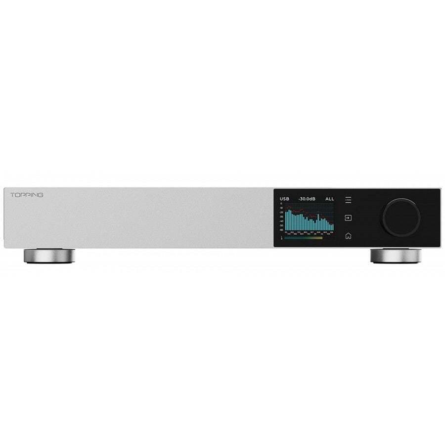 Cihazın ön panelinde, Topping’in Aurora UI arayüzüyle çalışan şık bir renkli ekran yer alır. Bu ekran sayesinde çalma bilgileri görüntülenebilir, cihaz ayarları kolayca yönetilebilir ve FFT spektrum analizörü ya da çeşitli VU metre görselleri izlenebilir. Cihaza, alüminyum gövdeli premium uzaktan kumanda da eşlik eder.