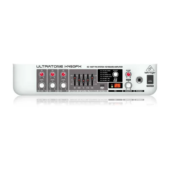 100 Şaşırtıcı Ayar Özelliğine Sahip Yerleşik 24Bit Dijital FX İşlemci, Sesinize Yüksek Teknoloji Bir Yankı, Koro, Flanş, Gecikme, Perde Kayması ve Diğer Efektler Ekler. FBQ Geribildirim Tespit Sistemimizle Devasa 45 Watt'lık Bir Güç Amplifikatörü, Konser Sınıfı 10" BUGERA Hoparlör, Stüdyo Sınıfı Multi-FX İşlemcisi ve 5 Bant Grafik EQ ile Donatılan ULTRATONE K450FX Tüm Potansiyelinizi Ortaya Çıkaracak.
