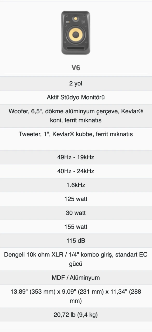 KRK V6S4, iki yönlü (2‑way) tam bant stüdyo referans monitörüdür. 1" Kevlar® tweeter ve 6.5" Kevlar® woofer ile orta ve yüksek frekanslarda netlik, düşük frekansta sıkı kontrol sağlar. Bi‑amped Class‑D amplifikatör ile sürücülere etkileyici tepki hızı ve netlik kazandırılır (toplam 155 W, woofer için 125 W, tweeter için 30 W).