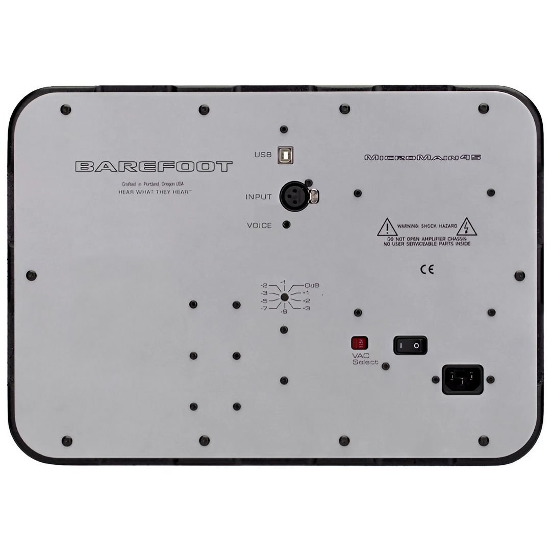 3 yollu aktif monitör olan Barefoot MicroMain45, MiniMain12’nin aynı amplifikatör, sinyal yolu ve sürücü teknolojisini kullanır. Orijinal ağırlığı 130+ lbs’yi 35+ lbs'lik bir pakete indirgenmesiyle MicroMain45, 8' bir alüminyum woofer, 2x 2,5' alüminyum midrange ve bir 1' tweeter içerir. 40Hz'lik bir bas tepkisinde -3dB, 40Hz - 45 kHz (± 3dB) ve 53 Hz - 40kHz (± 1dB) frekans tepkisi ile, Barefoot meraklılarının tanıdığı ve sevdiği sesi sunmaktadır.