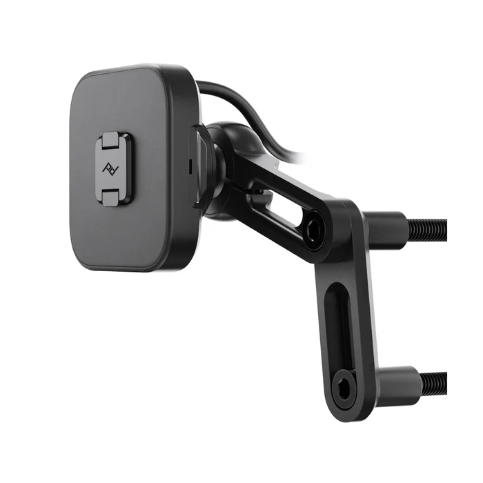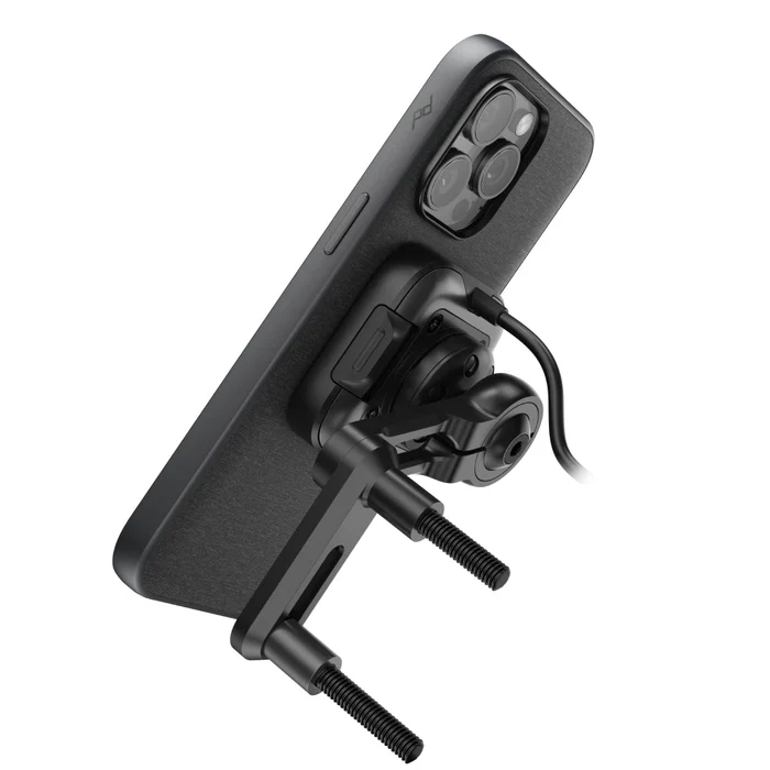 Motorcycle Brake/Clutch Mount — Charging (Locking, Qi2), fren/debriyaj perch bağlantı noktalarına takılarak telefonu sürüş sırasında güvenle sabitlemek ve aynı anda şarj etmek için tasarlanır. Peak Design’ın SlimLink™ manyetik + mekanik kilitlemesi, kaba titreşimlerde dahi sıkı tutuş ve tek elle hızlı tak-çıkar hedefler..