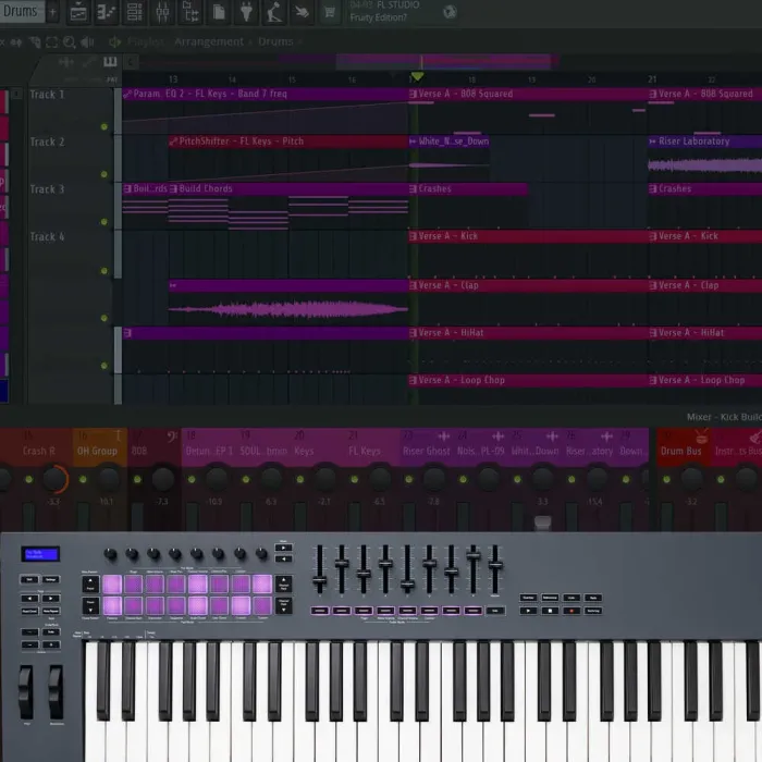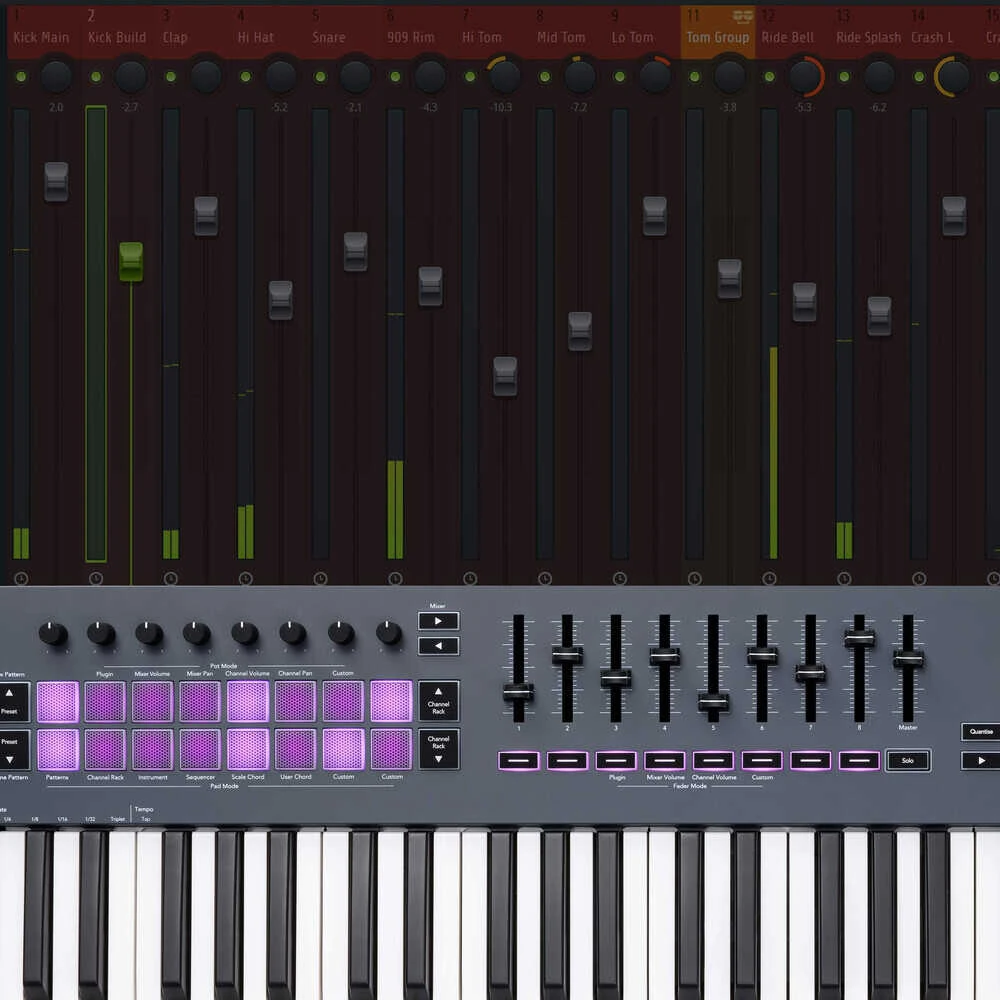 FLkey61, FL Studio’nun Mixer ve Channel Rack kontrollerini bilgisayar ekranından alıp doğrudan ellerinize taşır. Sekiz pot ve dokuz fader ile ses seviyelerini, pan ayarlarını ve otomasyonları gerçek zamanlı olarak kontrol edebilirsiniz. Taşıma, skor kaydı, geri al/ileri al, quantize ve metronom gibi temel işlevlere tek tuşla ulaşarak, prodüksiyon sürecinizi daha verimli ve akıcı hale getirebilirsiniz.