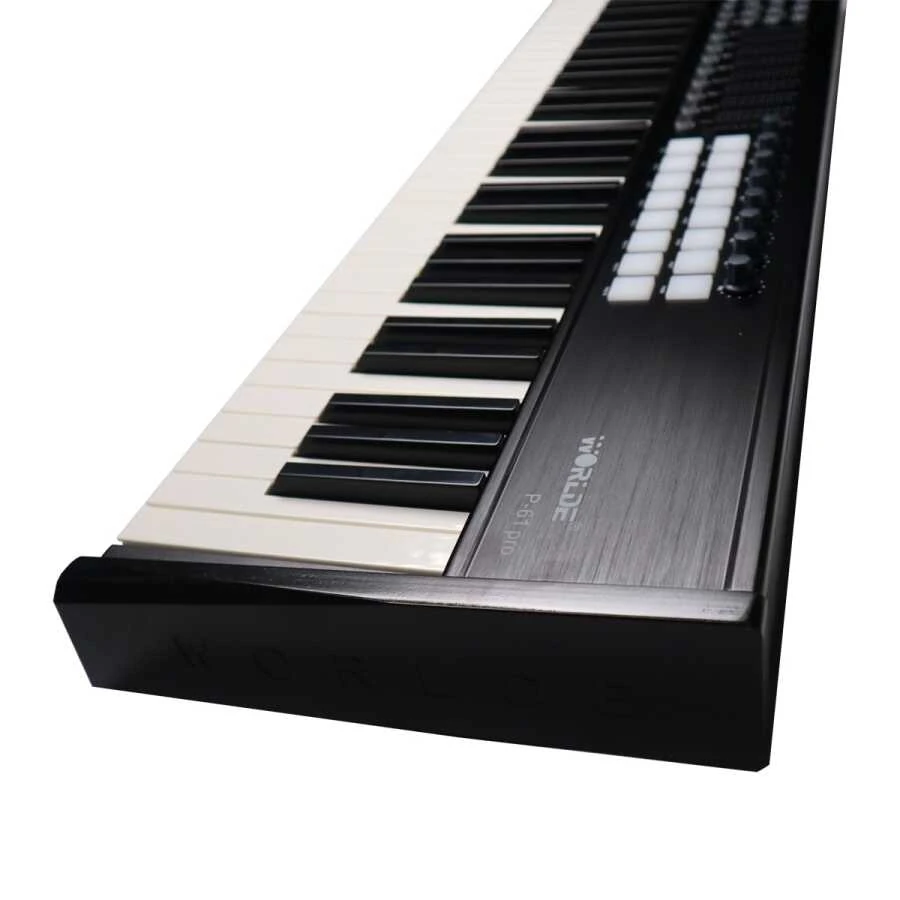 Worlde P-61 PRO, müzik prodüksiyonunda sınırları zorlamak isteyen profesyoneller ve ileri seviye kullanıcılar için tasarlanmış bir master MIDI klavyedir. Fırçalanmış alüminyum paneliyle hem dayanıklılık hem de estetik açıdan üst düzey bir deneyim sunan bu model, stüdyo ve sahne ortamlarında güvenle kullanılabilir. 61 adet yarı ağırlıklı tuşu ve aftertouch özelliği sayesinde, performansınıza hassasiyet ve ifade katmak hiç olmadığı kadar kolay. Worlde P-61 PRO, modern müzik prodüksiyonunun gerektirdiği tüm kontrol ve esnekliği bir arada sunarak, yaratıcı süreçlerinizi hızlandırır ve kolaylaştırır. Ürünün öne çıkan performans pad’leri, RGB arka aydınlatmalı ve hem hız hem de basınç hassasiyetine sahip olup, canlı performanslarda veya stüdyo çalışmalarında maksimum kontrol sağlar. Kullanıcı tarafından atanabilir 8 encoder ve 8 slider ile miksajdan efekt kontrolüne kadar birçok işlemi kişiselleştirebilir, 20 fonksiyon tuşu ile program değişimi, kanal seçimi, kontrol atama, transpozisyon, oktav ve düzenleme gibi işlemleri hızlıca gerçekleştirebilirsiniz. Ayrıca, dinamik pitch bend ve modülasyon için dokunmatik şeritler, MIDI In/Out bağlantıları ve pedal girişleriyle Worlde P-61 PRO, her türlü prodüksiyon ortamına kolayca entegre olur. USB 2.0 uyumluluğu, sürücü gerektirmeyen kurulumu ve geniş işletim sistemi desteğiyle, hem Windows hem de Mac kullanıcıları için sorunsuz bir deneyim sunar.