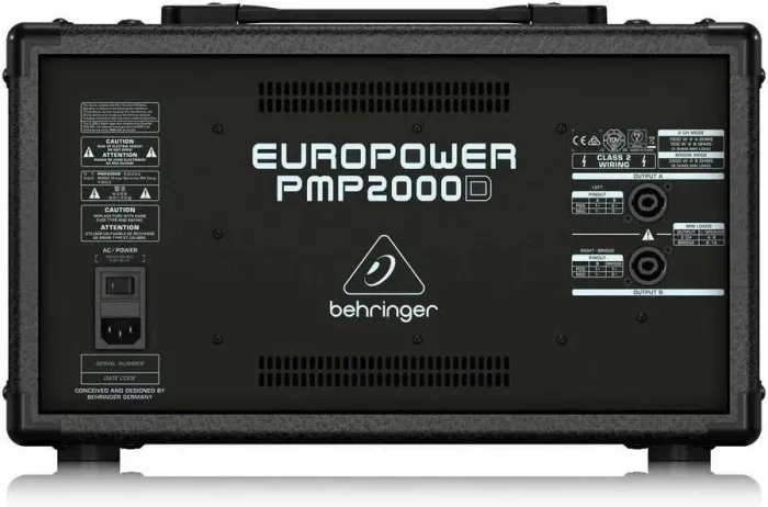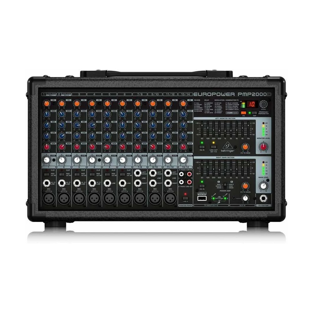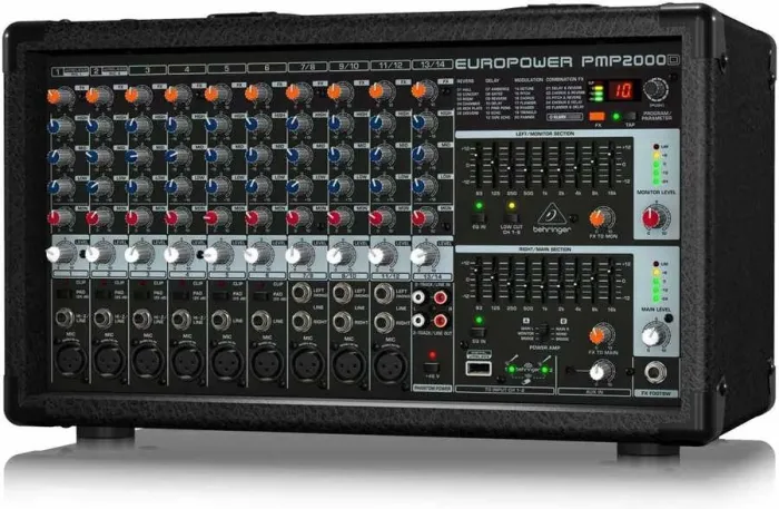 Behringer Europower PMP2000D Power Mikser. Güçlü PMP2000D size 2 x 1000 Watt stereo, 2 x 1000 Watt çift mono (1 Şebeke gücü, 1 Monitör ile çalışan çıkış) veya 2.000 Watt'lık köprülenmiş mono modu seçeneklerini sunar.