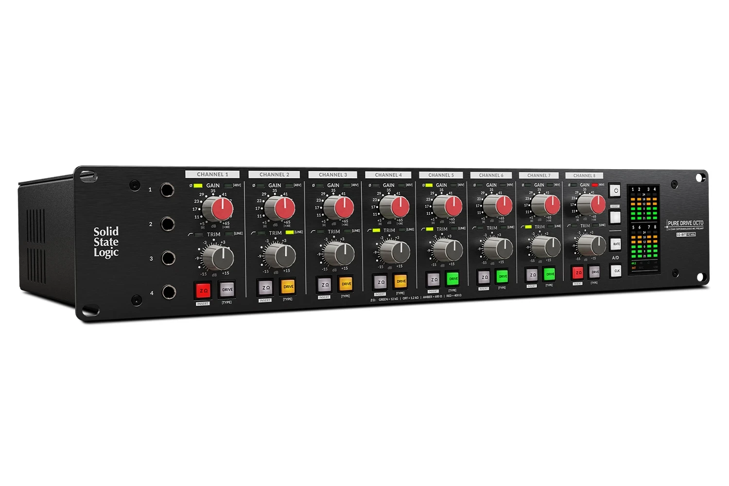 Solid State Logic PURE DRIVE OCTO, ORIGIN konsolundan alınan SuperAnalogue™ PureDrive™ mikrofon preamplifikatör teknolojisini kompakt bir 2U rack formatında sunar. Üç farklı karakter moduyla donatılmış olan bu preamp, Clean, Classic Drive ve Asymmetric Drive seçenekleriyle geniş bir ses yelpazesi sunarak kristal berraklığıyla saf bir kayıt veya sıcak, harmonik zenginlikte bir ton elde etmenizi sağlar. Bağımsız +48V phantom gücü, polarite çevirme ve 75Hz High Pass Filter, preamp kanal başına kontrol edilebilir. İleri seviye dijital dönüştürme ve USB ses kartı entegrasyonu, PURE DRIVE OCTO’yu yüksek kaliteli stüdyo ve sahne kayıtları için mükemmel hale getirir.