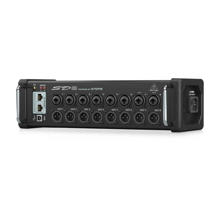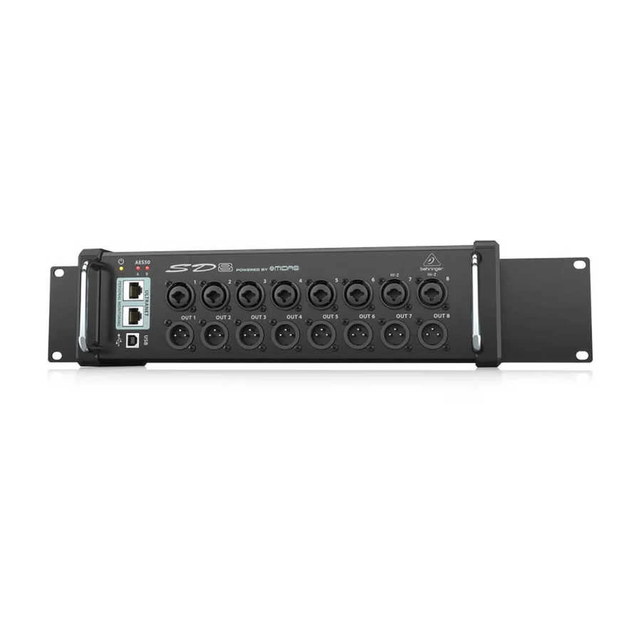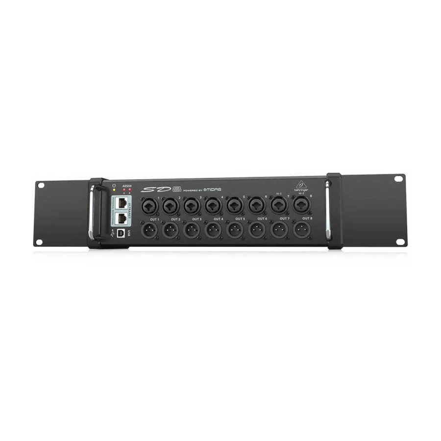 Behringer SD8 Dijital Snake IO Stage Box. PC'den sistem güncellemeleri için USB konektörü vardır.