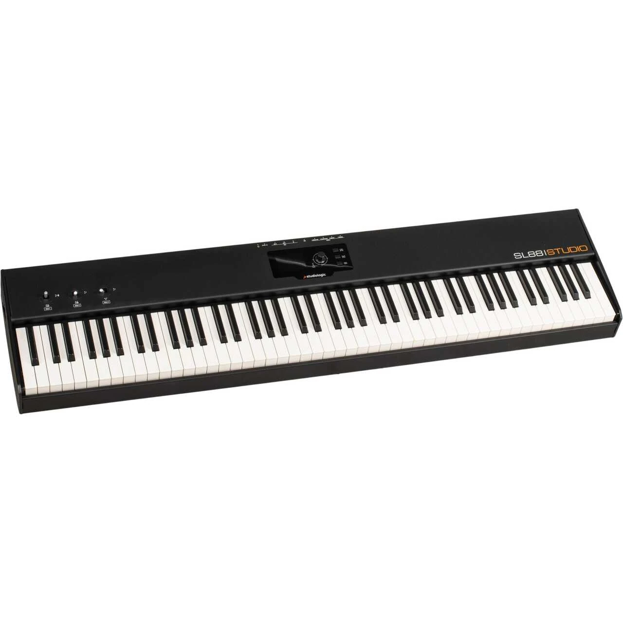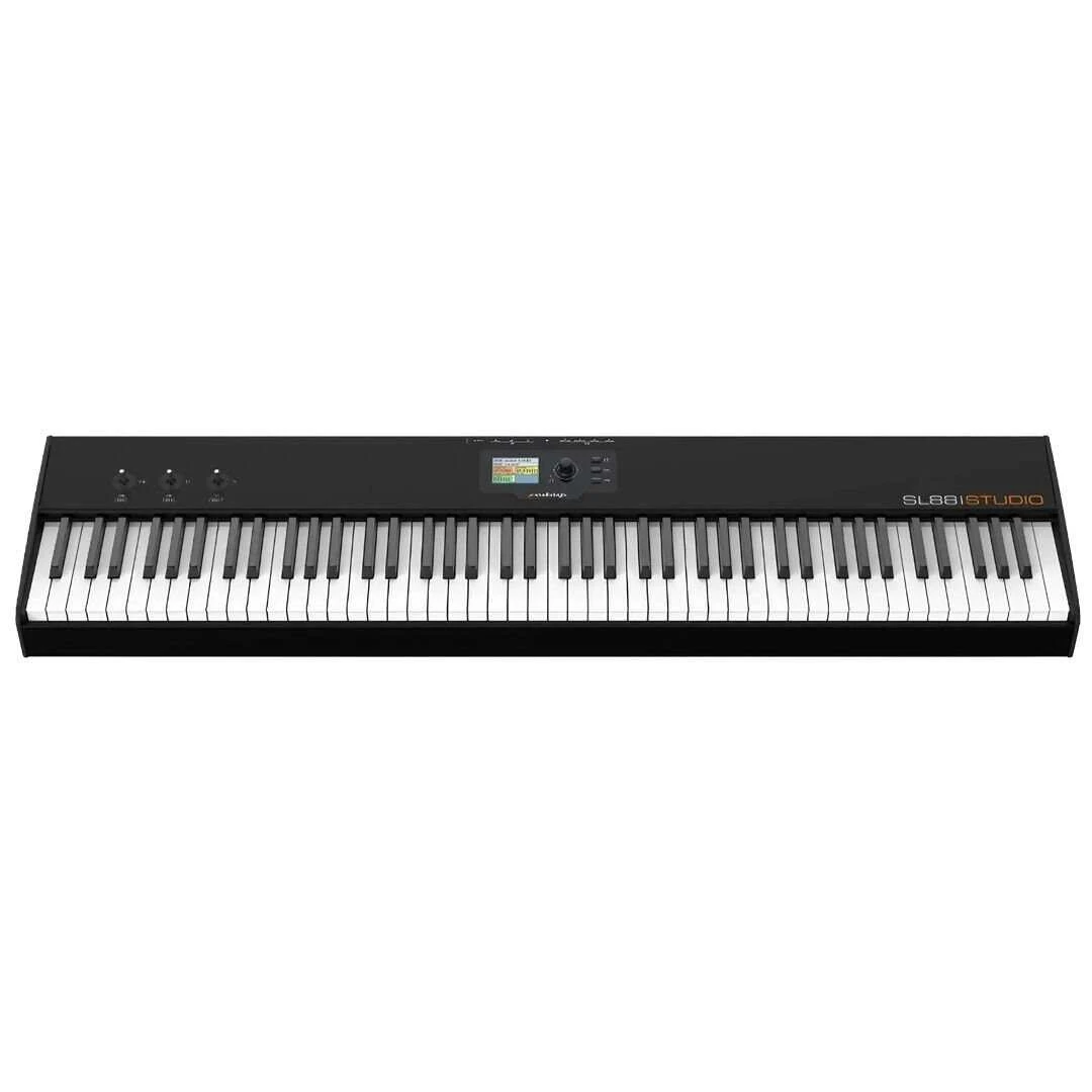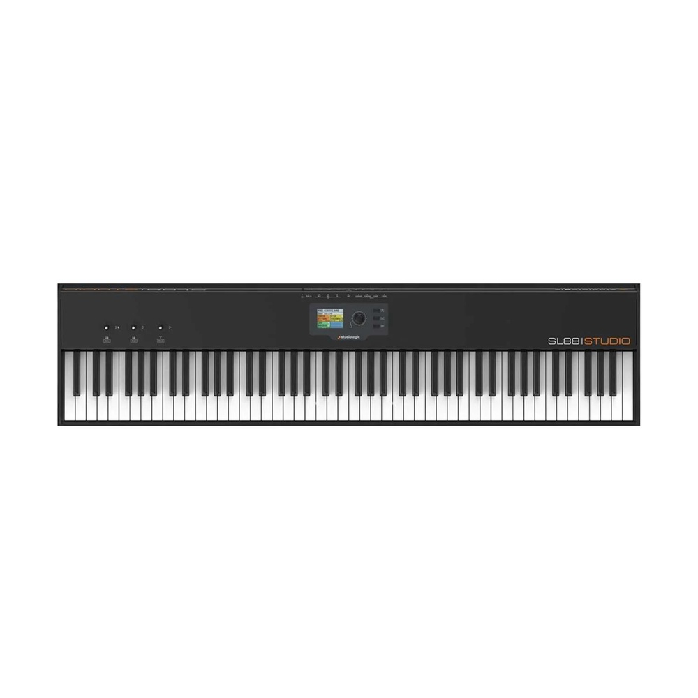 Studiologic by Fatar SL 88 Studio, sahne ve stüdyo ortamlarında müzisyenlerin beklentilerini aşan bir MIDI klavye olarak öne çıkıyor. Yenilikçi TP/100LR Premium Hammer Action tuş yatağı, gerçek piyano hissiyatını hafiflik ile buluşturuyor. Tamamen metal gövdesi ve yüksek dayanıklılığa sahip sentetik materyal kaplaması, uzun süreli ve yoğun kullanımlarda bile güvenli bir performans sunuyor. SL88 Studio, yalnızca 13,7 kg ağırlığıyla taşınabilirliği ön plana çıkarırken, kompakt yapısı sayesinde dar alanlarda dahi rahatça kullanılabiliyor. Sahne müzisyenlerinden ev stüdyosu sahiplerine kadar geniş bir kullanıcı kitlesine hitap eden bu model, sisteminizin kalbi olmaya aday. SL88 Studio’nun merkezinde yer alan TFT renkli ekran ve 6 yönlü kontrol düğmesi, kullanıcıya hızlı ve sezgisel bir erişim sağlıyor. Menüde kolayca gezinebilir, dört farklı bölümü tek bir dokunuşla yönetebilirsiniz. Üç adet X/Y düzlemde hareket edebilen stick, performans sırasında gerçek zamanlı kontrol ve ses manipülasyonu imkanı sunuyor. Manyetik ray sistemi sayesinde nota veya dizüstü bilgisayarınızı kolayca yerleştirebilir, çalışma alanınızı kişiselleştirebilirsiniz. SL88 Studio, kutu içeriğinde gelen Studiologic PS100 siviç pedalı ve güç adaptörüyle birlikte, sahne ve stüdyo kullanımına eksiksiz bir başlangıç sunuyor. Cihazın kendi içinde ses üretmediğini, bilgisayar (DAW veya plugin) üzerinden seslerin tetiklendiğini belirtmekte fayda var. USB kablosunun kutu içeriğinde yer almadığını göz önünde bulundurmalısınız.