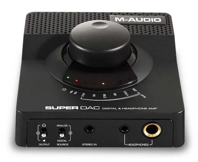 M‑Audio Super DAC, bilgisayarınızdaki ses sinyallerini analog hoparlör veya kulaklığa dönüştürmek için tasarlanmış yüksek çözünürlüklü bir USB-DAC’tır. Audiophile seviyesinde Wolfson DAC/ADC çipleri ile 24‑bit / 192 kHz kalitesine kadar ses dönüşümü sağlar. Referans kalitede ses isteyenler ve dahili ses kartlarının kalitesinden memnun olmayan kullanıcılar için idealdir.