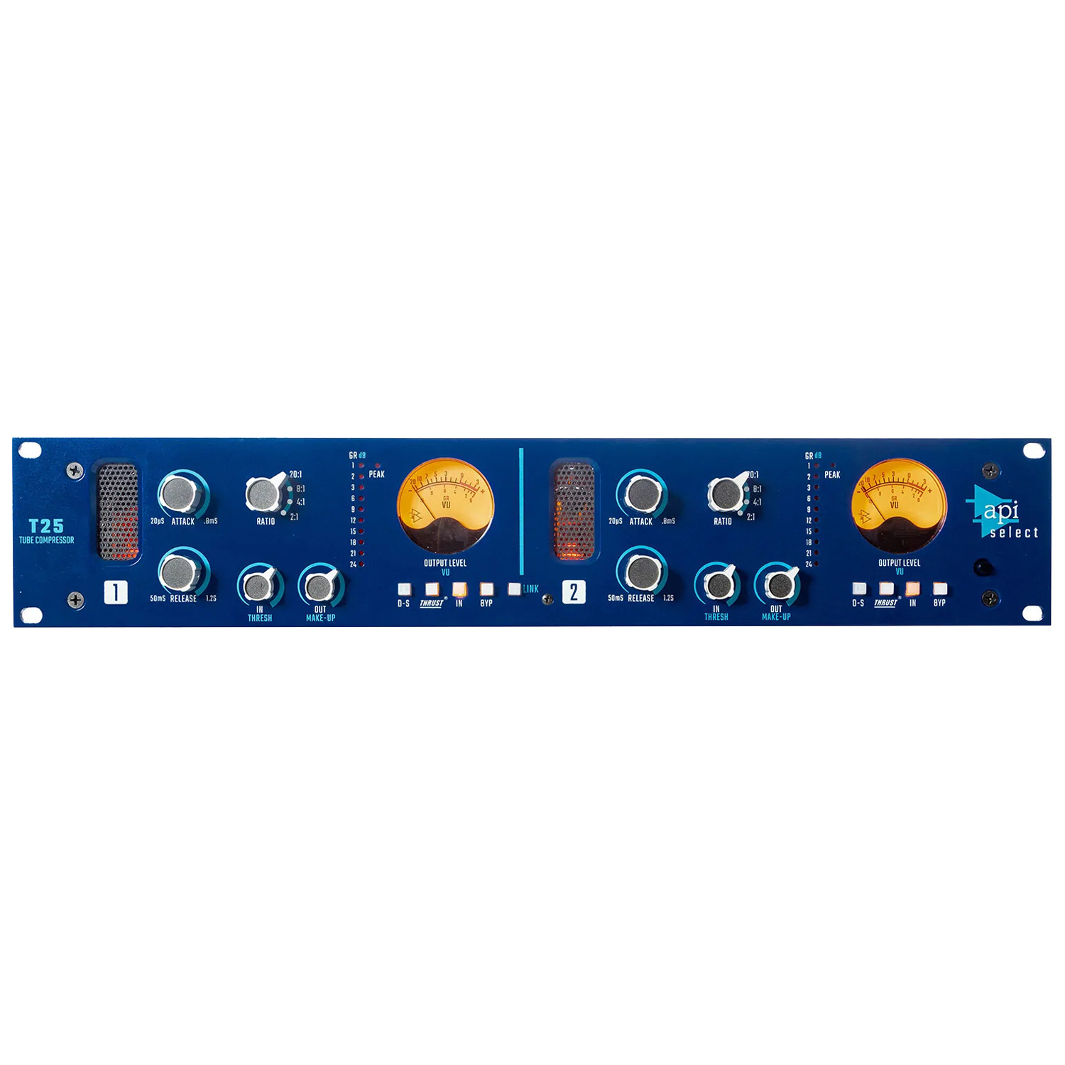 API Select serisinin parlayan yıldızı T25, özel (custom) API transformatöründen beslenen Class-A tüplü çıkış katına sahip, klasik 2 kanallı, FET tabanlı feedback stili bir kompresör/limiter ünitesidir. 12AT7WC ve 12BH7 çift triyotlu vakum tüpleriyle inşa edilen T25, API'nin dünyaca ünlü kompresör serisinde yepyeni bir yönü (new direction) temsil eder. Markanın o meşhur, hızlı ve agresif solid-state (katı hal) dinamik kontrolünü, efsanevi vakum tüplerinin sunduğu zengin harmonik yapı ve sıcak analog karakter ile benzersiz bir şekilde birleştirir.