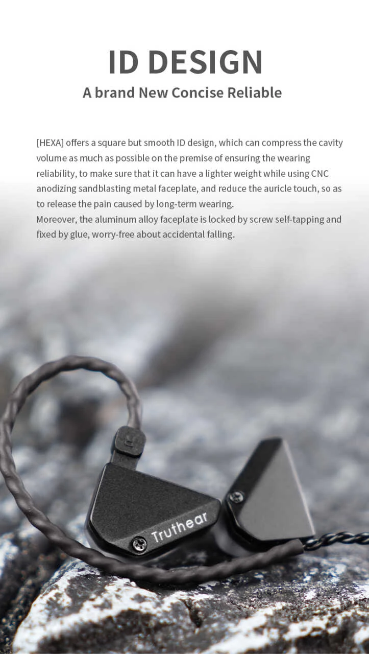 Truthear Hexa 1DD 3BA, yalnızca ses performansıyla değil, aynı zamanda zarif ve minimalist tasarımıyla da öne çıkar. HeyGears’ın DLP 3D baskı teknolojisiyle üretilen kavite, tıbbi sınıf yüksek şeffaflık reçinesi ve hassas yüzey taşlama işlemiyle tamamlanmıştır. Bu sayede, kulak içi monitör hem hafif hem de ergonomik bir yapıya kavuşur; kulak konturuna mükemmel uyum sağlar ve uzun süreli kullanımlarda dahi rahatsızlık vermez. CNC eloksal kumlama metal ön yüz, kulak kepçesine temas eden noktaları minimize ederek, uzun süreli dinlemelerde oluşabilecek ağrıyı azaltır. Kare ve pürüzsüz ID tasarımı, hem estetik hem de işlevsel bir avantaj sunar. Alüminyum alaşımlı ön yüzey, kendinden kılavuzlu vida ve yapıştırıcı ile sabitlenerek dayanıklılığı artırır. Cilt dostu ve güvenilir malzemelerle üretilen Truthear Hexa 1DD 3BA, hem profesyonel müzisyenlerin hem de müzik tutkunlarının beklentilerini karşılayacak şekilde tasarlanmıştır.