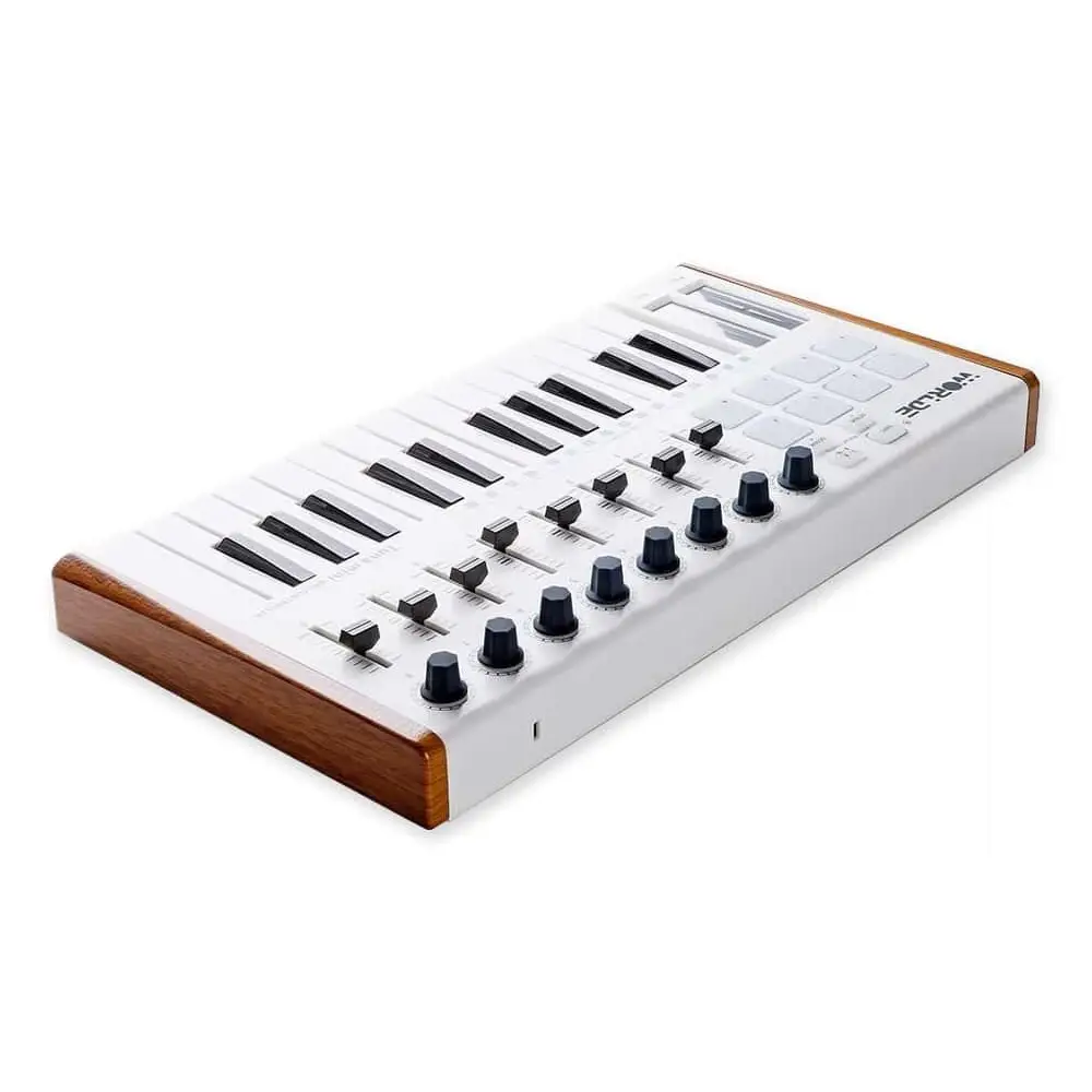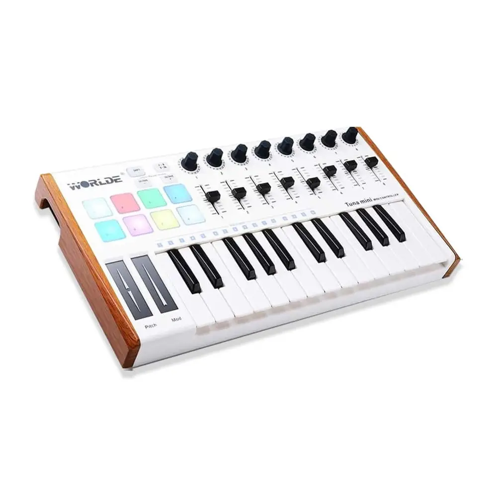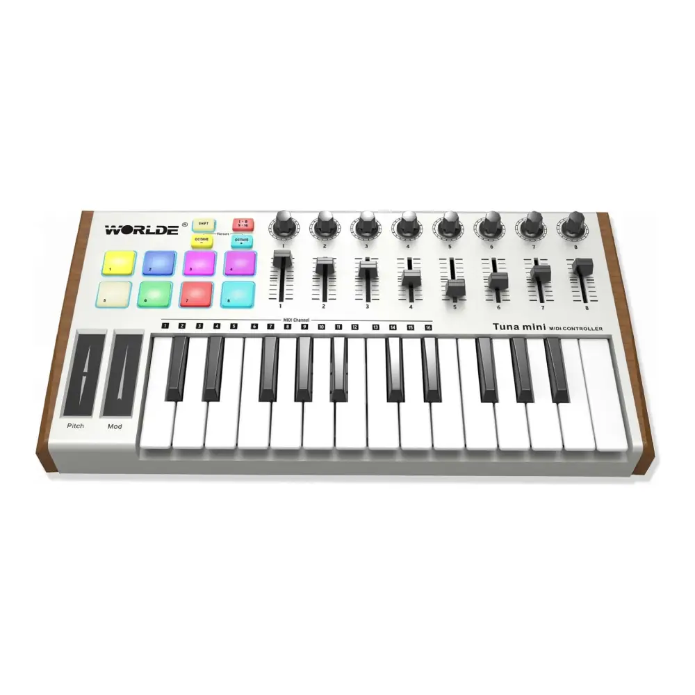 Worlde Tuna Mini, modern müzik prodüksiyonunun gereksinimlerine yanıt veren, taşınabilirliği ve fonksiyonelliğiyle öne çıkan bir MIDI klavye ve DAW kontrol cihazıdır. 25 adet hassas mini tuşu, 8 atanabilir potu, 8 renkli pad’i ve 8 fader’ı ile Tuna Mini, küçük boyutuna rağmen profesyonel düzeyde kontrol imkânı sunar. Ahşap görünümlü yan panelleriyle estetik açıdan da dikkat çeken bu cihaz, hem Mac hem de PC platformlarında tüm büyük DAW yazılımlarıyla uyumlu çalışır. Tuna Mini, müzik prodüktörlerinden sahne sanatçılarına, ev stüdyosu kullanıcılarından mobil müzisyenlere kadar geniş bir kullanıcı kitlesine hitap eder. 8 adet RGB aydınlatmalı, hız ve basınca duyarlı pad’i toplamda 16 pad olarak kullanılabilir şekilde tasarlanmıştır. Bu sayede, canlı performanslarda veya stüdyo kayıtlarında hangi pad’in yüklü, çalıyor ya da kayıt halinde olduğunu anında görebilirsiniz. Shift tuşu ile ön ayarları hızlıca çağırabilir veya ana MIDI kanalını seçebilirsiniz. Klavye aralığını ±4 oktav arasında kaydırabilme özelliği, geniş melodik ve armonik olanaklar sunar. Worlde Tuna Mini, Cubase, FL Studio, Logic gibi popüler DAW yazılımlarıyla tam uyumluluk gösterir. Ayrıca, uygun adaptör kablosu ile iPad veya akıllı telefonlara da bağlanabilir. Sürdürülebilir performans için sustain pedal girişi ve USB 2.0 tam hız desteğiyle, güç ihtiyacını doğrudan USB üzerinden karşılar. Sürücü gerektirmeyen ve tak-çalıştır desteğiyle öne çıkan Tuna Mini, hızlı kurulum ve esnek kullanım avantajı sağlar. Hafif ve kompakt yapısı sayesinde, stüdyodan sahneye, her ortamda müzikal yaratıcılığınızı özgürce ifade edebilirsiniz.