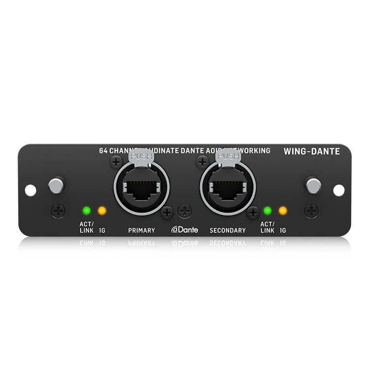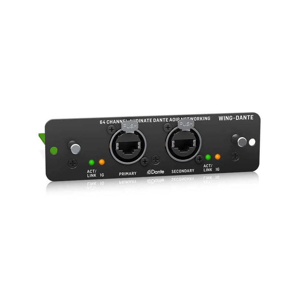 64 kanallı 48 kHz çift yönlü ses arabirimi, WING'i Dante özellikli IP ağlarıyla entegrasyona hazır hale getirerek daha da fazla I/O seçeneği getiriyor. Dante, Audinate'in tescilli bir AoIP çözümüdür ve aynı zamanda geliştirilmiş birlikte çalışabilirlik için AES67 standardına uygundur. DSCP tabanlı QoS ile standart 100Mbit/s veya Gigabit Ağ altyapısını kullanır ve aynı ağ üzerinde bir arada bulunan karışık örnek ve bit hızlarını destekler. WING-DANTE kartı, örnek hassas senkronizasyon ve düşük gecikme ile 24 bit sinyal iletimini kullanarak en yüksek ses bütünlüğünü sağlar. İkincil girişi, kesintisiz, yedekli bir ağ erişimi kurmanıza olanak tanır.