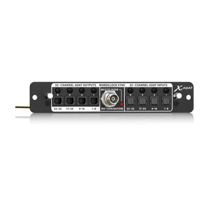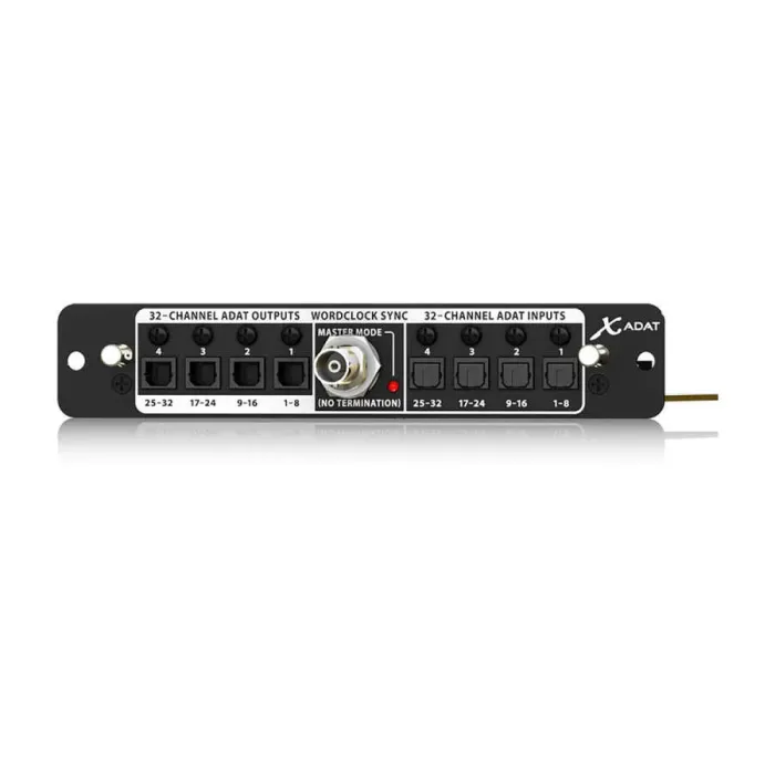 X-ADAT Genişletme Kartı, X32'nizi ADAT Bağlantısının Gerekli Olduğu Herhangi Bir Durumda Birleştirmenize Olanak Tanır , X32 Serisi Konsolların Canlı, Stüdyo, AV ve Entegrasyon Uygulamalarında Kullanımını genişletir . X-ADAT Kartında, X32'yi Harici Bir Saatle Arayüzlemek veya Diğer Cihazlar İçin Saat Sinyali Sağlamak İçin Kullanılabilecek Bir BNC Kelime Saati Giriş ve Çıkışı Bulunmaktadır. Harici Saat Senkronizasyonu, 4 Toslink Girişinden Herhangi Birinin Yanı Sıra BNC Bağlantısı Yoluyla da Mümkündür.