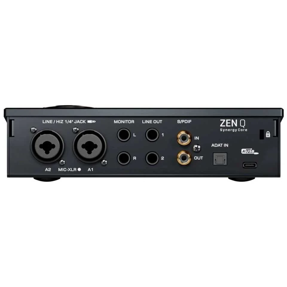 Zen Q Synergy Core, 2 adet analog Mic/Line girişi, 2 adet analog Line/Hi-Z girişi, 2 monitör çıkışı, 2 line çıkışı, 2 kulaklık çıkışı, ADAT ve S/PDIF dijital giriş/çıkışları ile donatılmıştır. DC-coupled giriş ve çıkışlar sayesinde modüler synthesizer’lar ile de tam uyumludur. Tüm bağlantılar, profesyonel stüdyo ve sahne gereksinimlerini karşılayacak şekilde optimize edilmiştir.